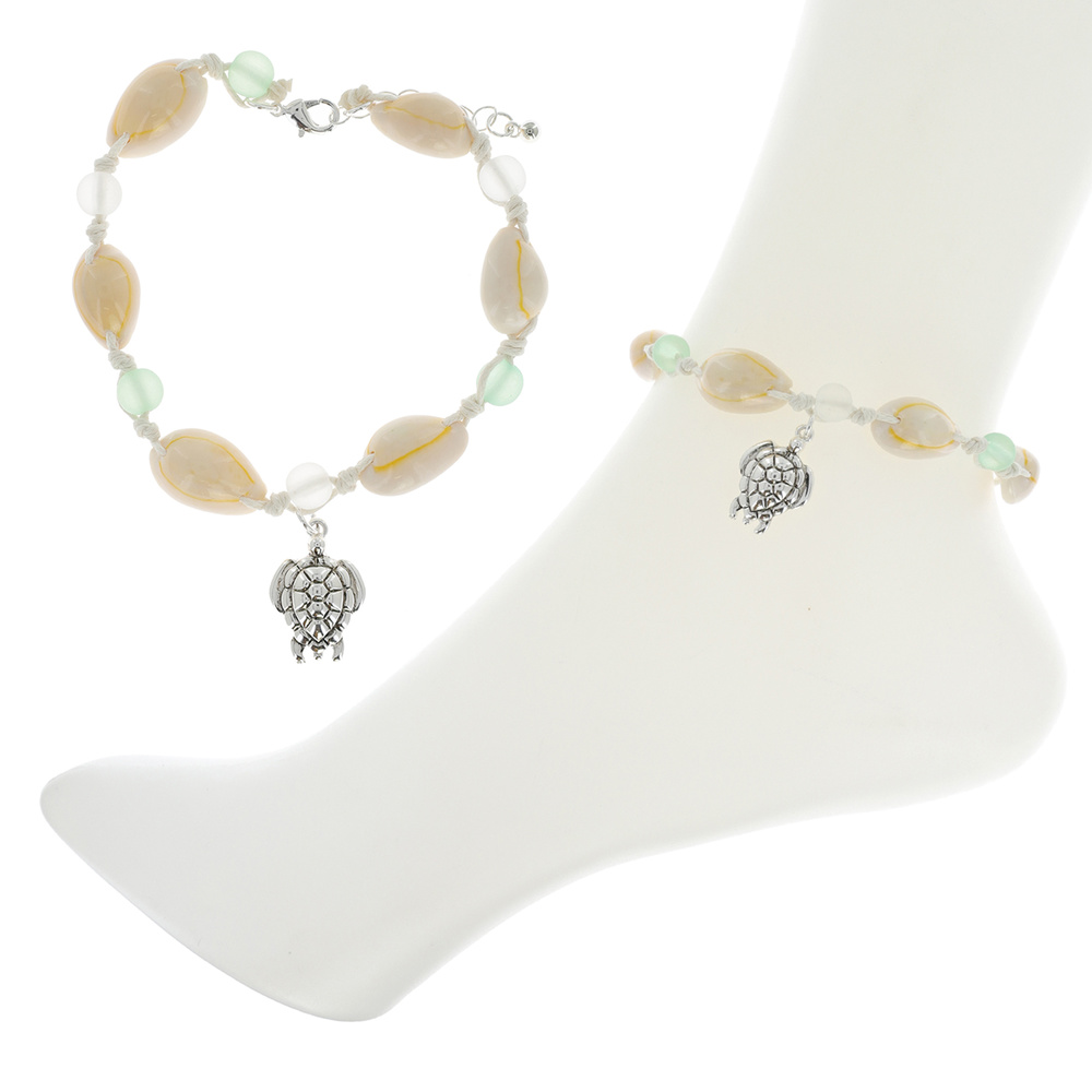 MARINE TURTLE -NAUTICAL THEMED ADJUSTABLE SEA GLASS BEADED CHARM ANKLET