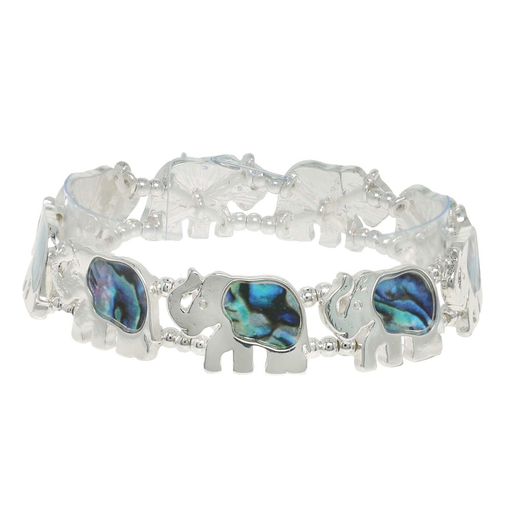 ABALONE SHELL SAFARI ELEPHANT LINK METAL STRETCH BRACELET IN SILVER TONE METAL