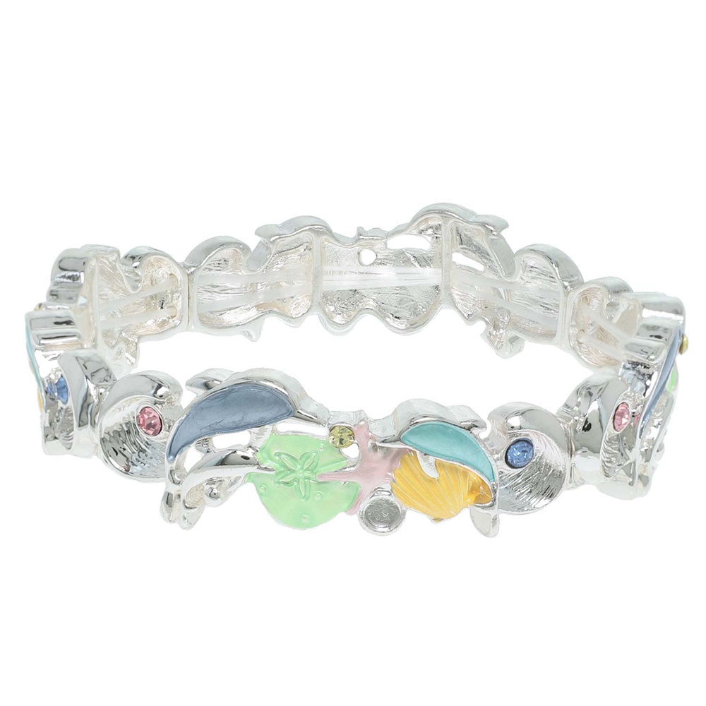 SEA LIFE DOLPHIN CRYSTAL RHINESTONE IRIDESCENT WAVE DESIGN ENAMEL COATED METAL STRETCH BANGLE BRACELET IN SILVER TONE METAL