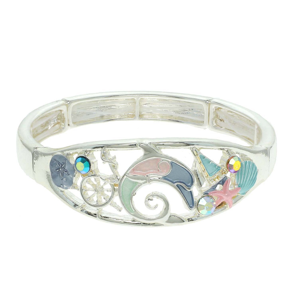 SEA LIFE DOLPHIN AB CRYSTAL RHINESTONE IRIDESCENT ENAMEL COATED METAL STRETCH BANGLE BRACELET IN SILVER TONE METAL