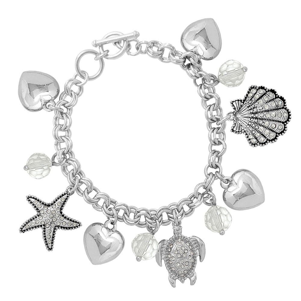 SEASHELL - NAUTICAL OCEAN THEMED TOGGLE CHARM BRACELET IN SILVER TONE METAL