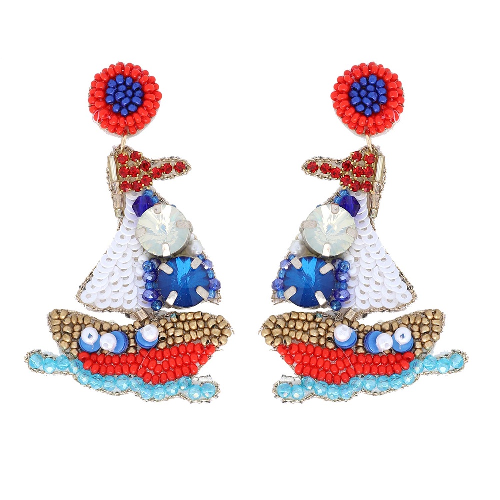 2-tier Jeweled Nautical Sailboat Yatch Beaded Embroidery Dangle And Drop Earrings