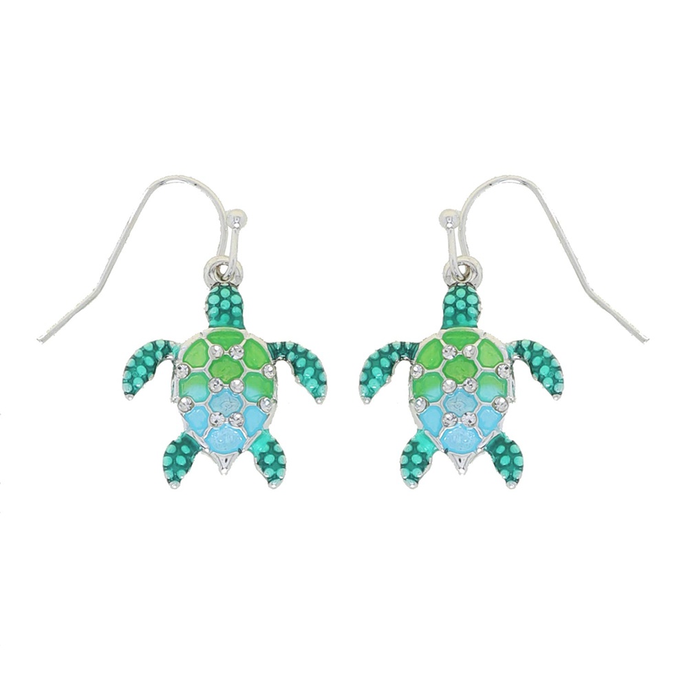SEA LIFE TURTLE ENAMEL COATED DANGLE AND DROP EARRINGS IN SILVER TONE METAL