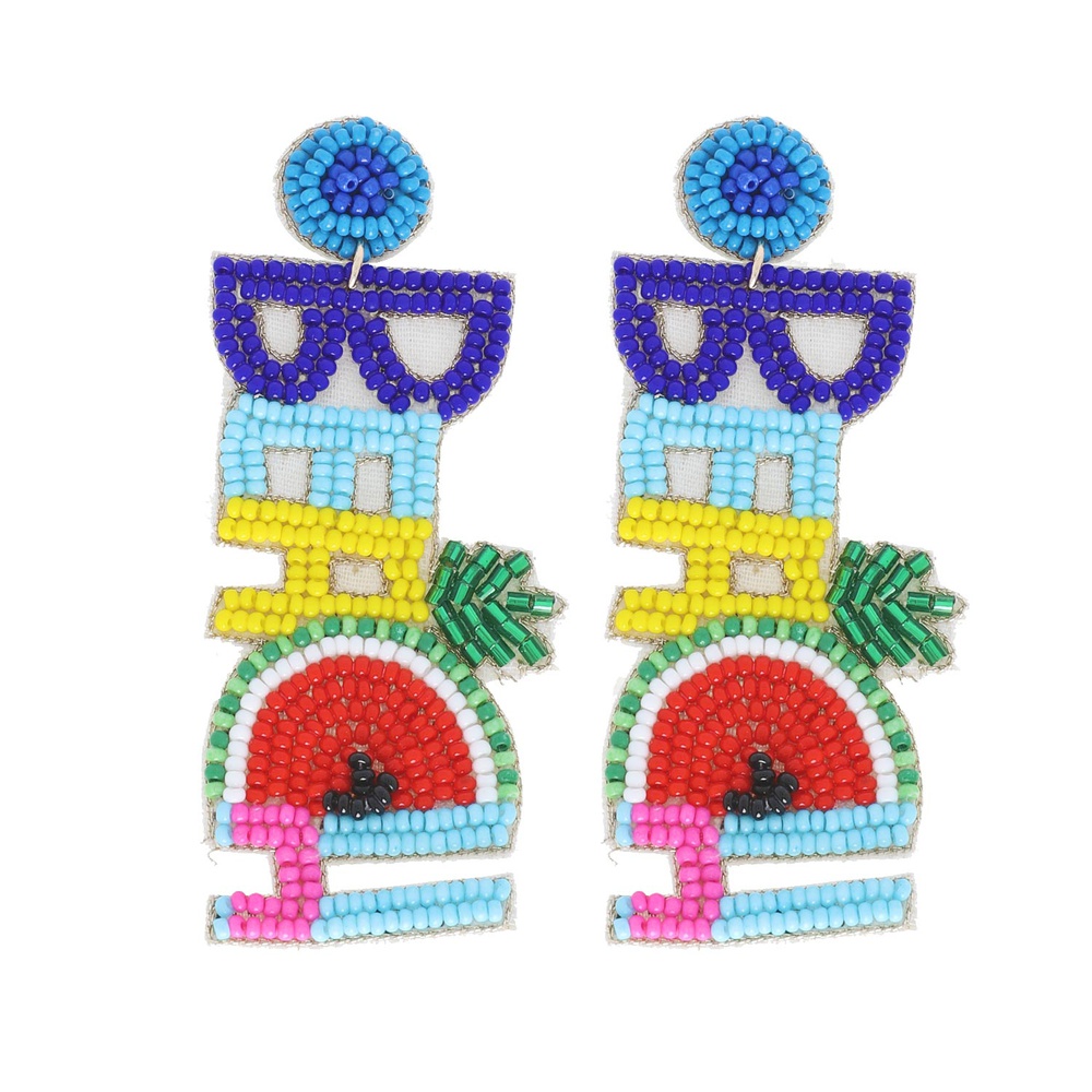 2-TIER MULTICOLOR TROPICAL BEACH LONG DROP BEADED EMBROIDERY EARRINGS