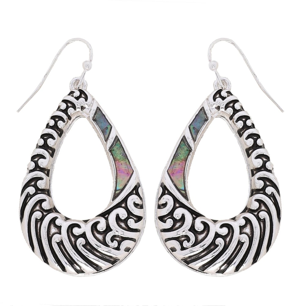 FILIGREE OPEN TEARDROP ABALONE DANGLE AND DROP FISH HOOK EARRINGS IN OXIDIZED SILVER TONE METAL