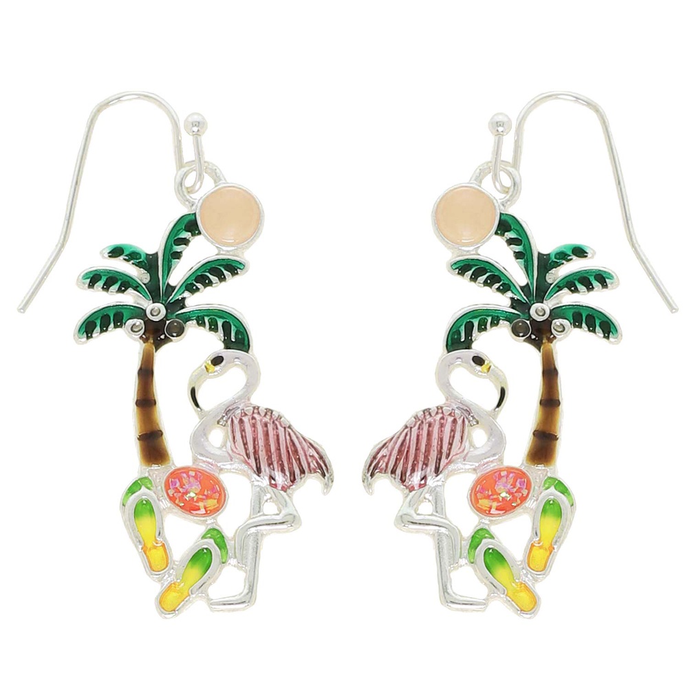 TROPICAL VACATION FLAMINGO OPAL GLITTER ENAMEL COATED FISH HOOK DROP EARRINGS IN SILVER TONE METAL