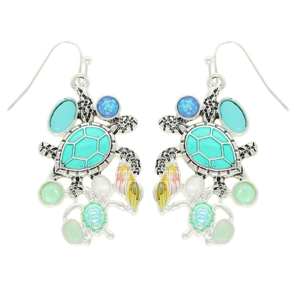 MARINE TURTLE IRIDESCENT ABALONE GEMSTONE CLUSTER ENAMEL COATED FISH HOOK DROP EARRINGS