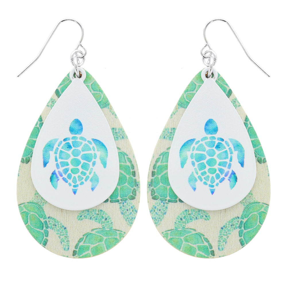 Turtle -marine Ocean Themed Wooden Teardrop Fish Hook Dangle Earrings