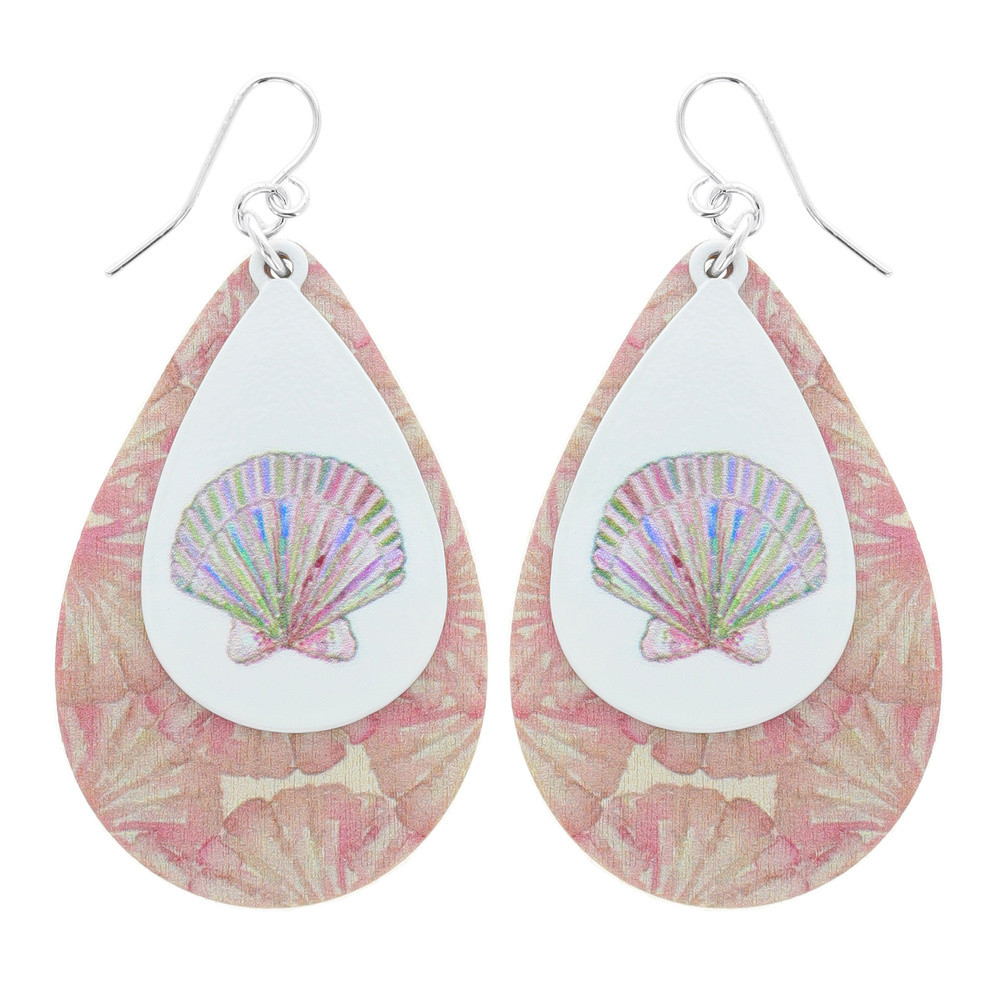 Clam - Marine Ocean Themed Wooden Teardrop Fish Hook Dangle Earrings