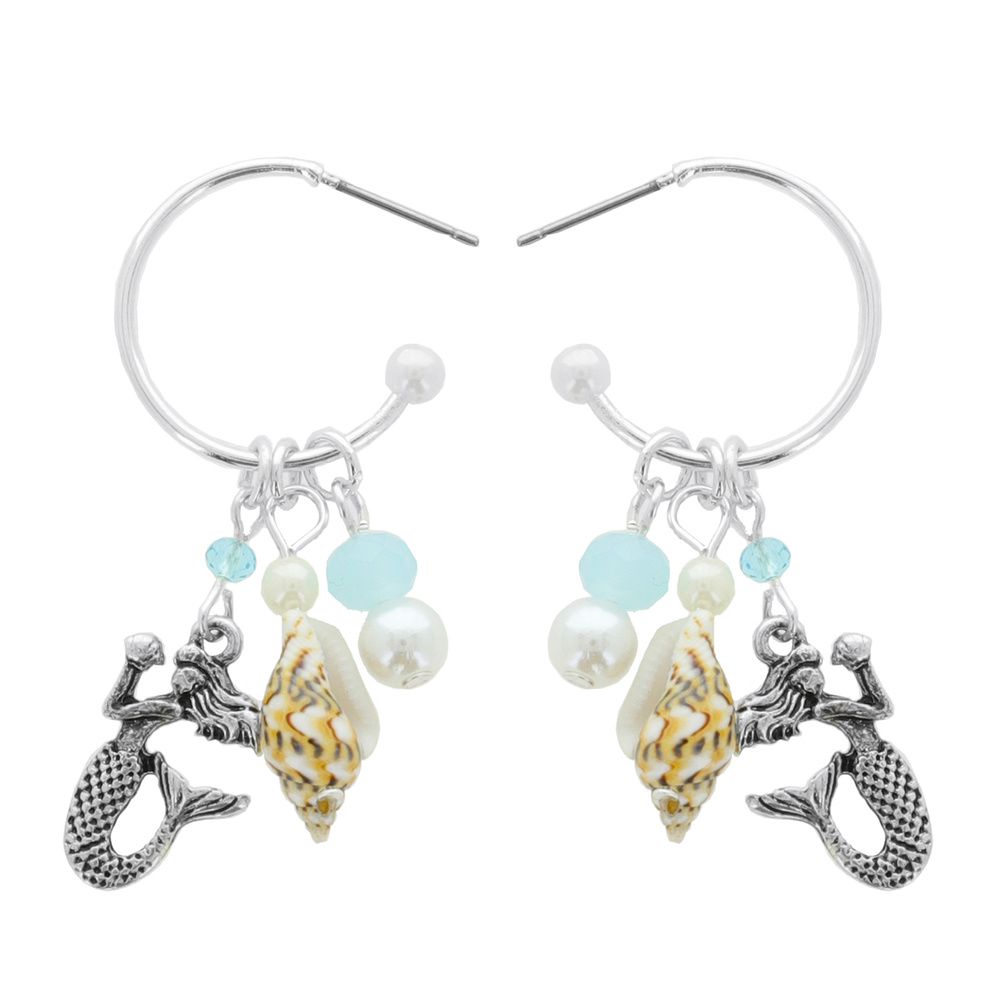 MERMAID - NAUTICAL OCEAN THEMED MULTI CHARM OPEN HOOP EARRINGS IN SILVER TONE METAL