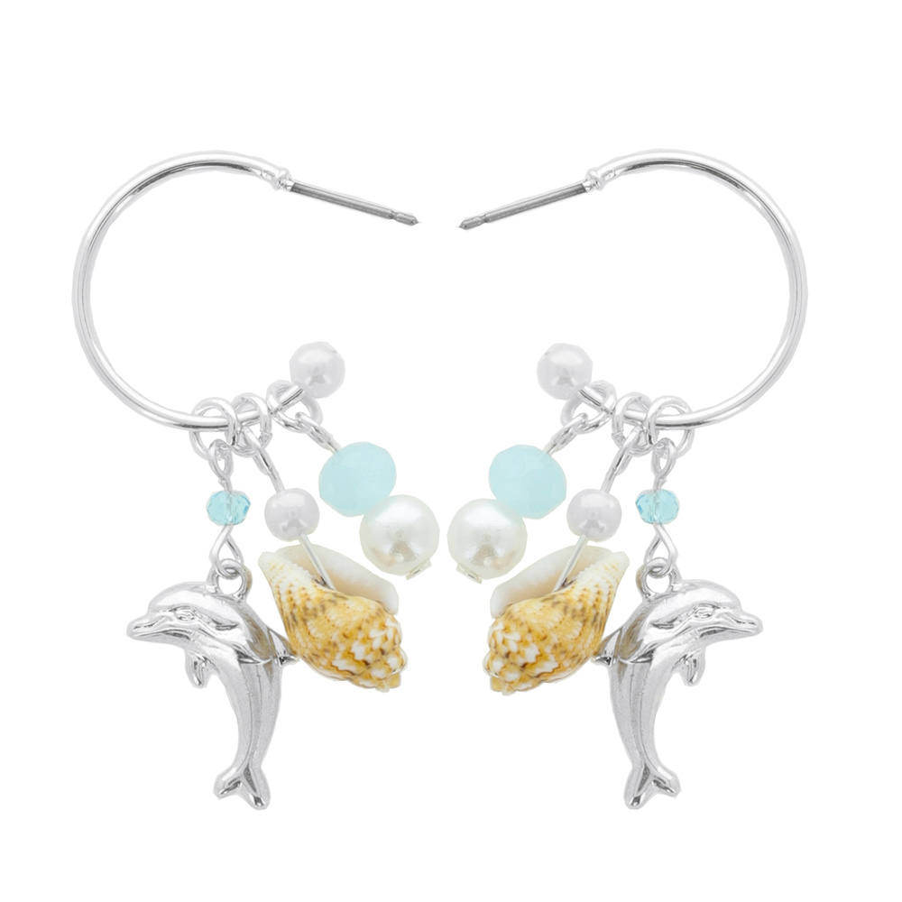 DOLPHIN - NAUTICAL OCEAN THEMED MULTI CHARM OPEN HOOP EARRINGS IN SILVER TONE METAL