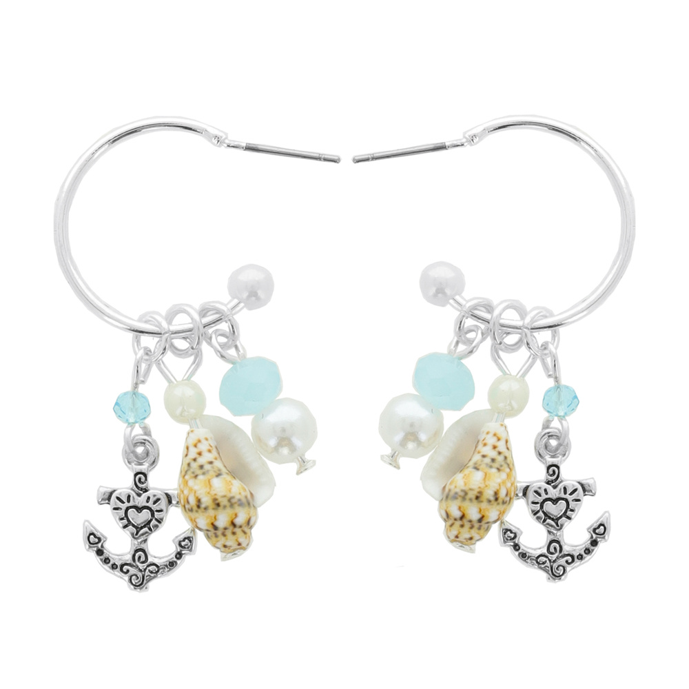 ANCHOR - NAUTICAL OCEAN THEMED MULTI CHARM OPEN HOOP EARRINGS IN SILVER TONE METAL