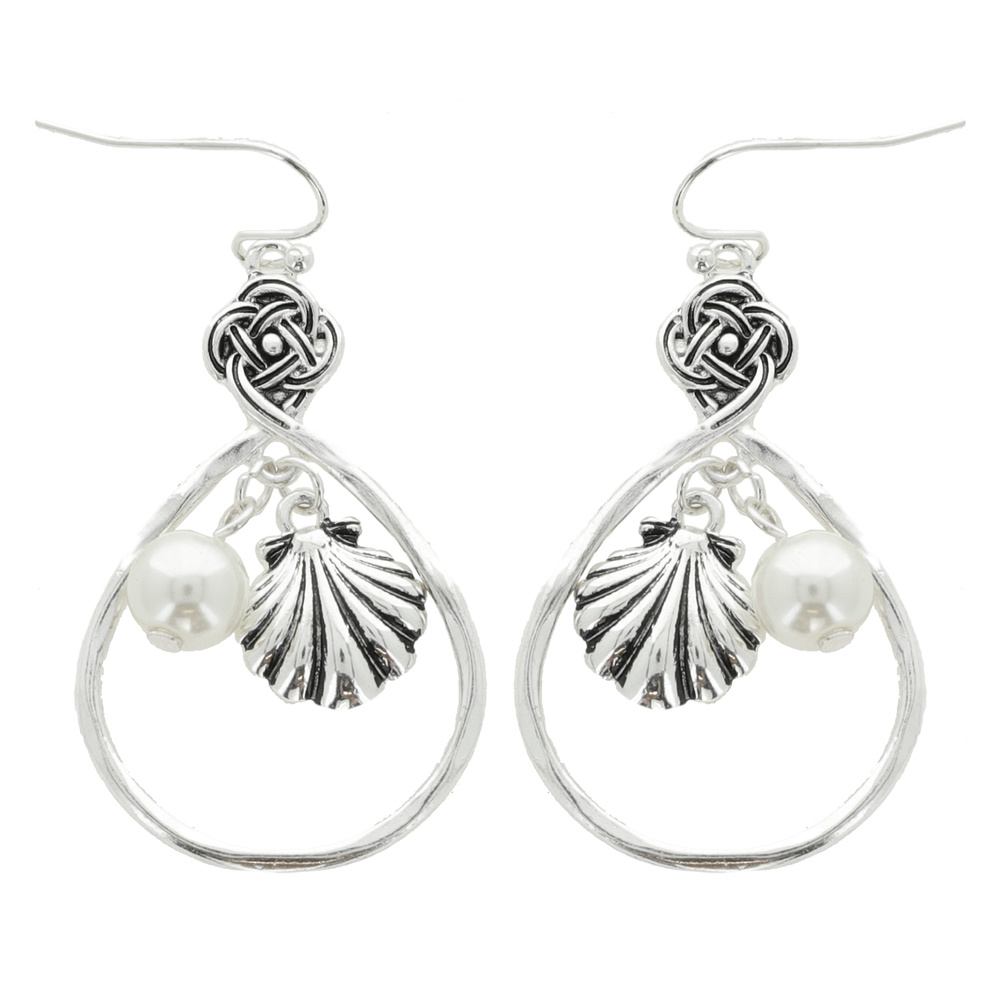 SHELL - OCEAN THEMED MULTI CHARM CELTIC KNOT TEARDROP FISH HOOK DANGLE EARRINGS IN SILVER TONE METAL