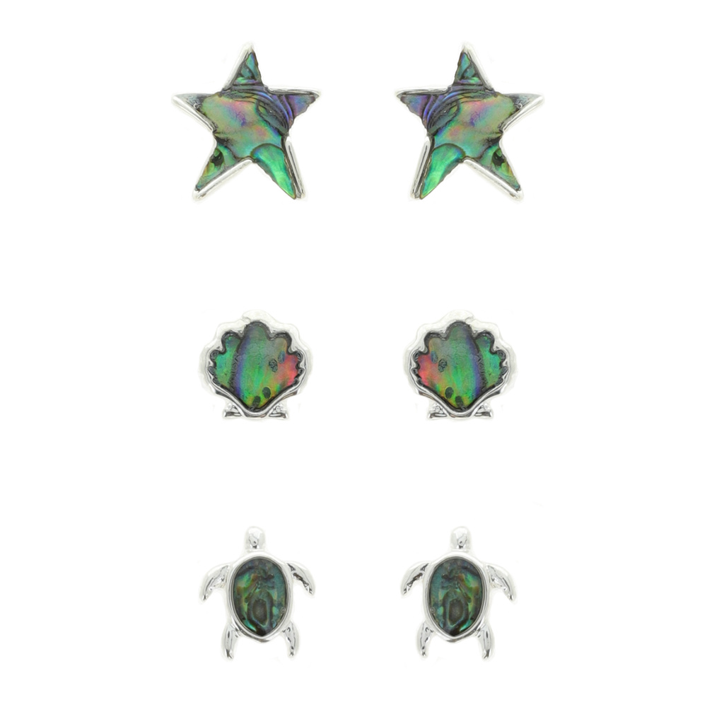 ABALONE IRIDESCENT FINISH SET- 3-PAIR SET-MARINE OCEAN THEMED STUD EARRINGS IN SILVER TONE METAL