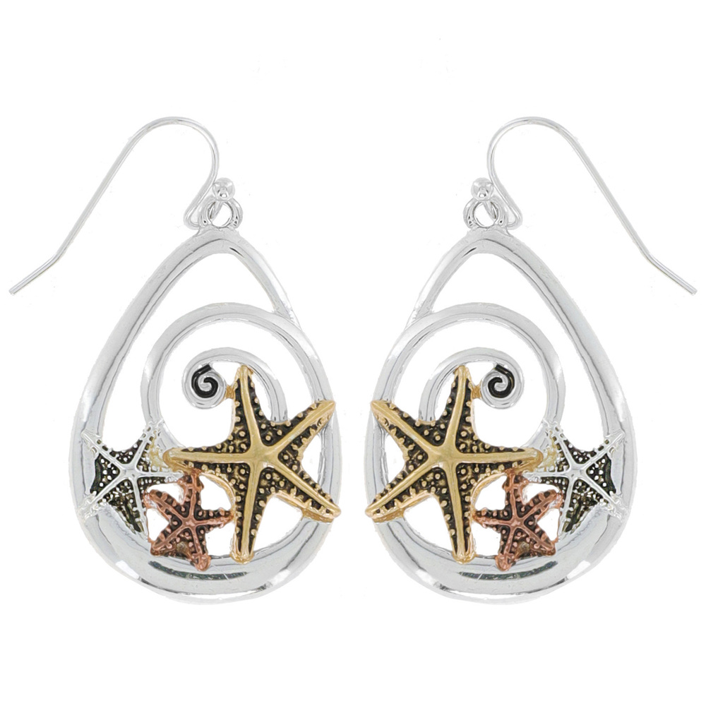 STARFISH TEARDROP- NAUTICAL SEA LIFE THREE TONE METAL SWIRL HOOK DANGLE EARRINGS