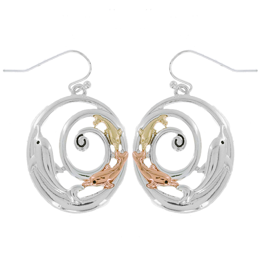DOLPHIN OVAL - NAUTICAL SEA LIFE THREE TONE METAL SWIRL HOOK DANGLE EARRINGS
