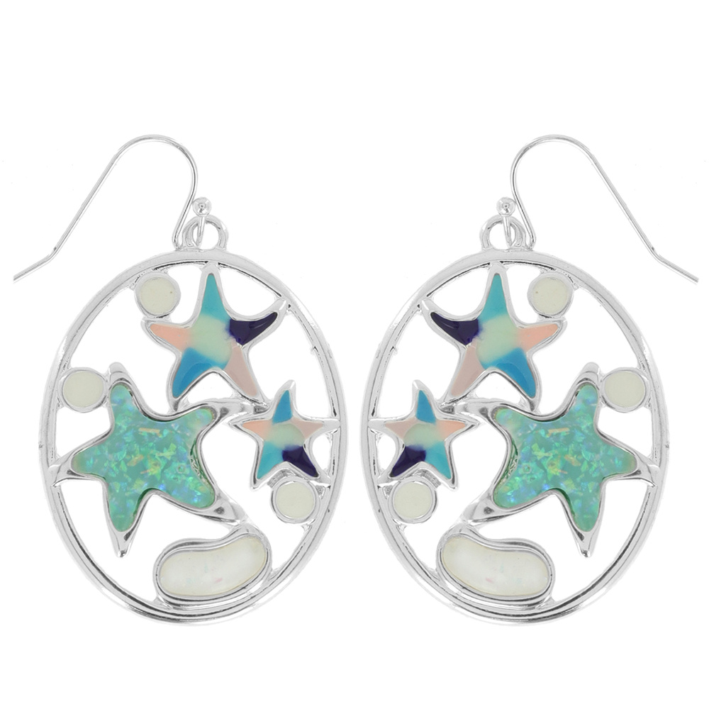 STARFISH -SEA LIFE SYNTHETIC INLAID OPAL ENAMEL OPEN TEARDROP/ OVAL DANGLE AND DROP HOOK EARRINGS