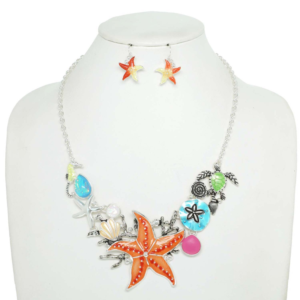 SEA LIFE ENAMEL COATED CRYSTAL GEMSTONE IRIDESCENT ABALONE STATEMENT BIB ADJUSTABLE NECKLACE EARRING SET