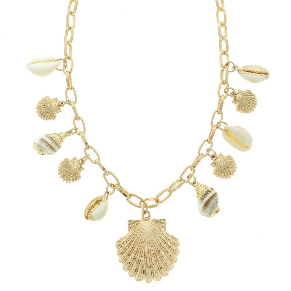 MULTI-CHARM COWRIE AND SCALLOP SHELL PENDANT NECKLACE IN GOLD-TONE METAL