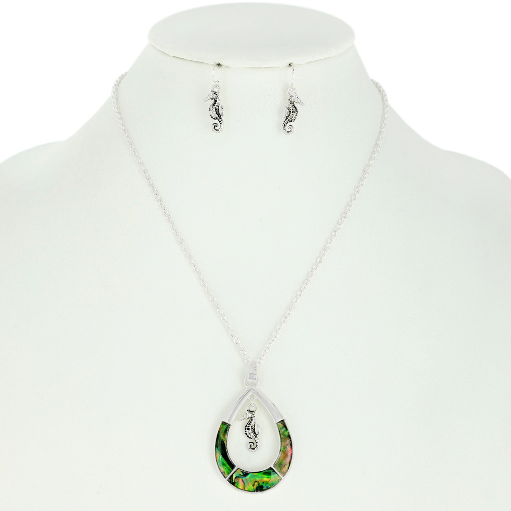 SEAHORSE ABALONE SHELL INLAY PENDANT NECKLACE AND EARRINGS SET