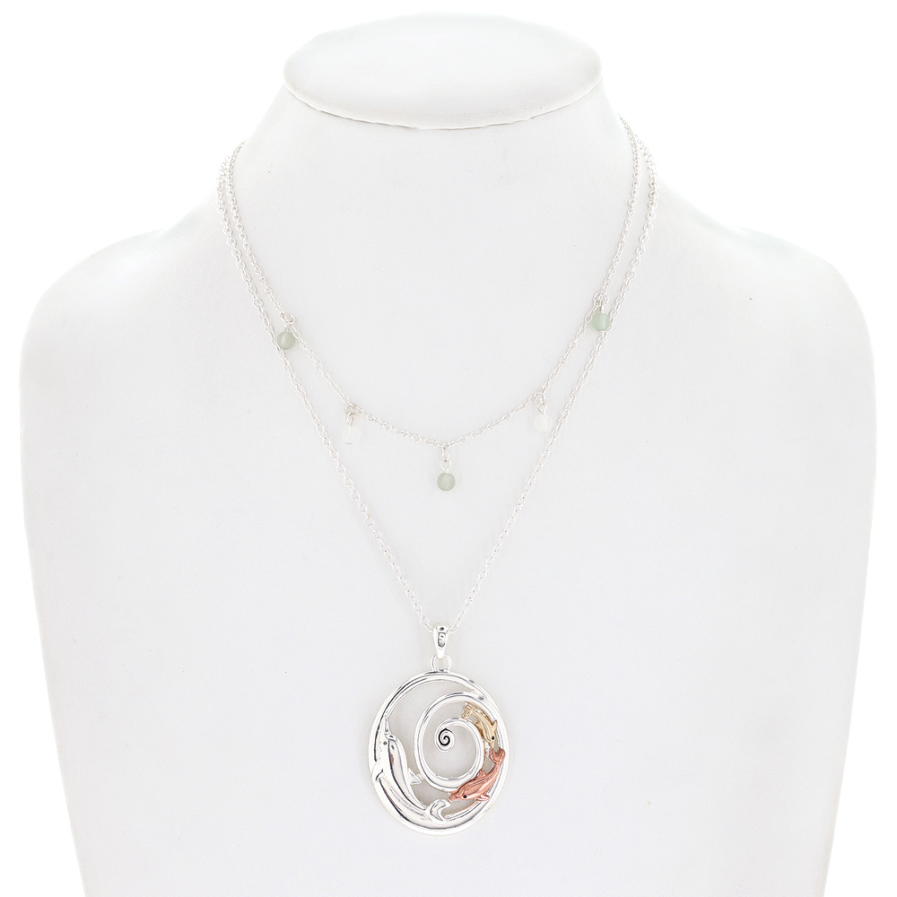 DOLPHIN - NAUTICAL SEA LIFE MULTILAYER BEADED THREE TONE METAL SWIRL PENDANT NECKLACE
