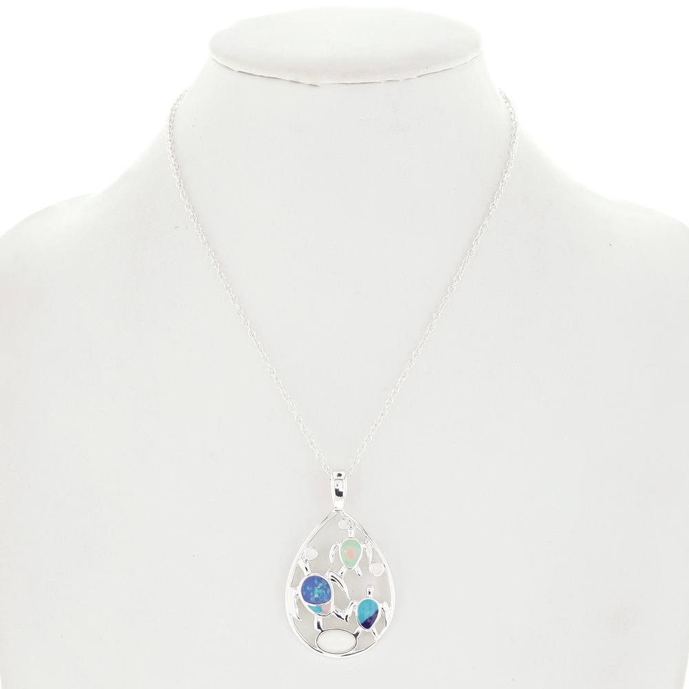SEA TURTLE-GLITTERED ENAMEL SYNTHETIC BLUE OPAL CUTOUT PENDANT NECKLACE