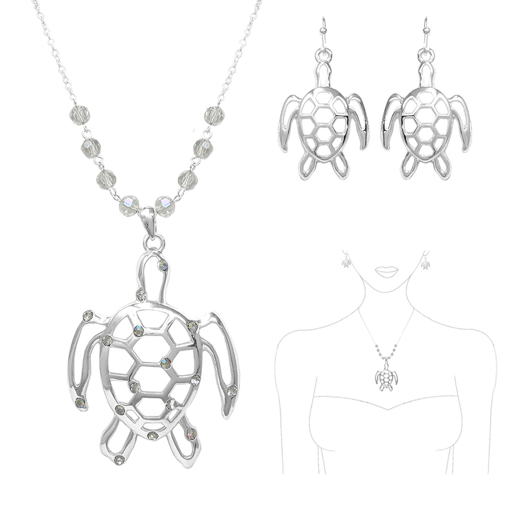 SEA TURTLE-SEA LIFE BEADED RHINESTONE CHAIN ADJUSTABLE NECKLACE EARRINGS SET