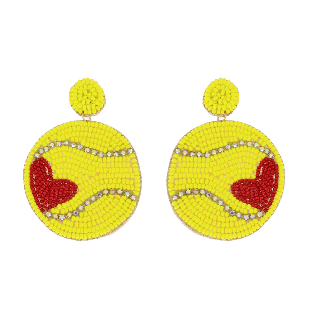 2-TIER JEWELED HEART TENNIS BALL HANDMADE BEADED EMBROIDERY DANGLE AND DROP NOVELTY EARRINGS