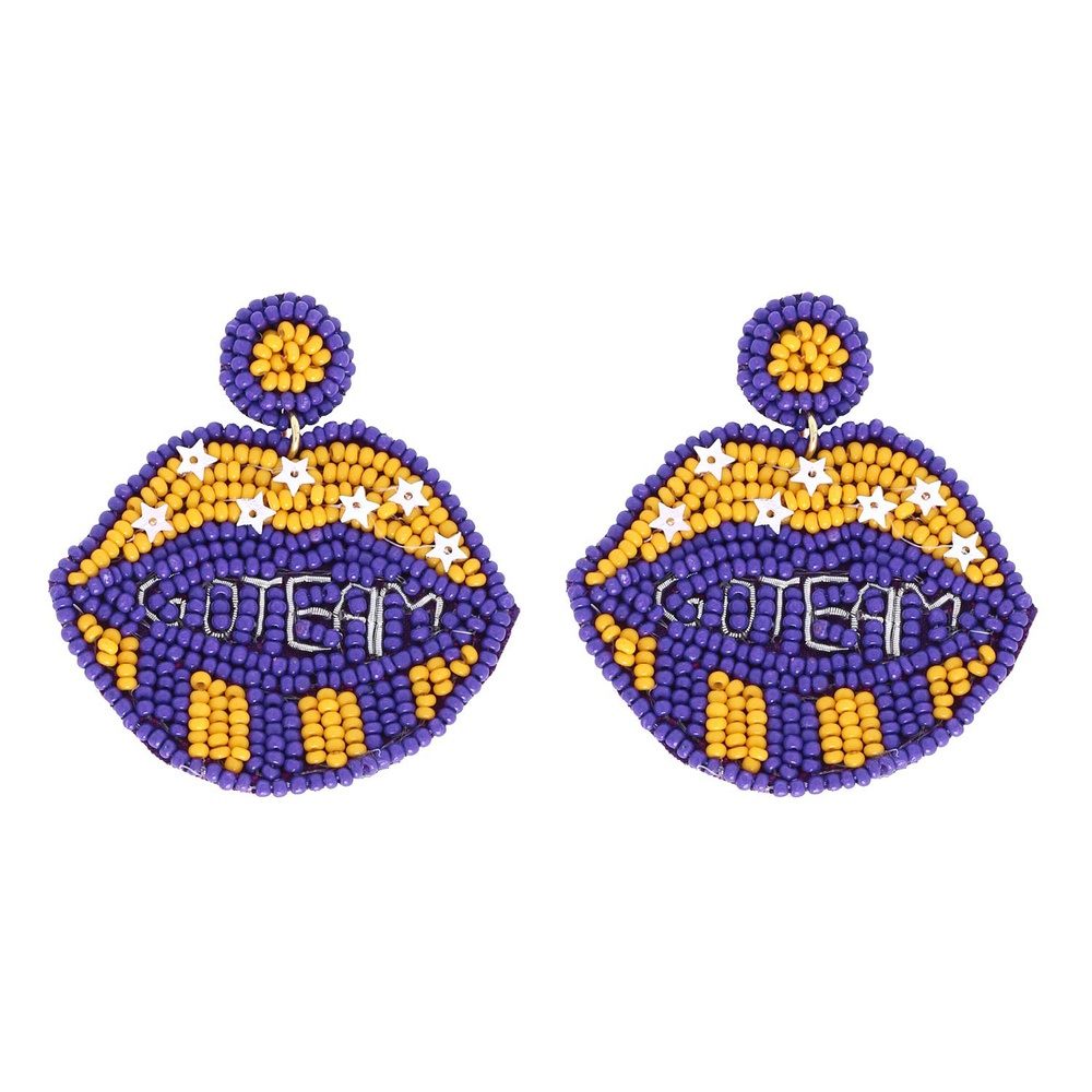 2-TIER TWO-TONE "GO TEAM" LIP SHAPED BEADED EMBROIDERY DANGLE AND DROP EARRINGS