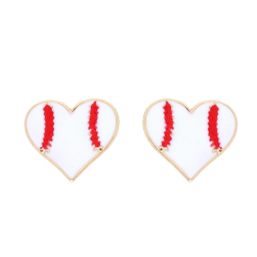 HEART SHAPED ENAMEL COATED BASEBALL STUD EARRINGS IN GOLD TONE METAL