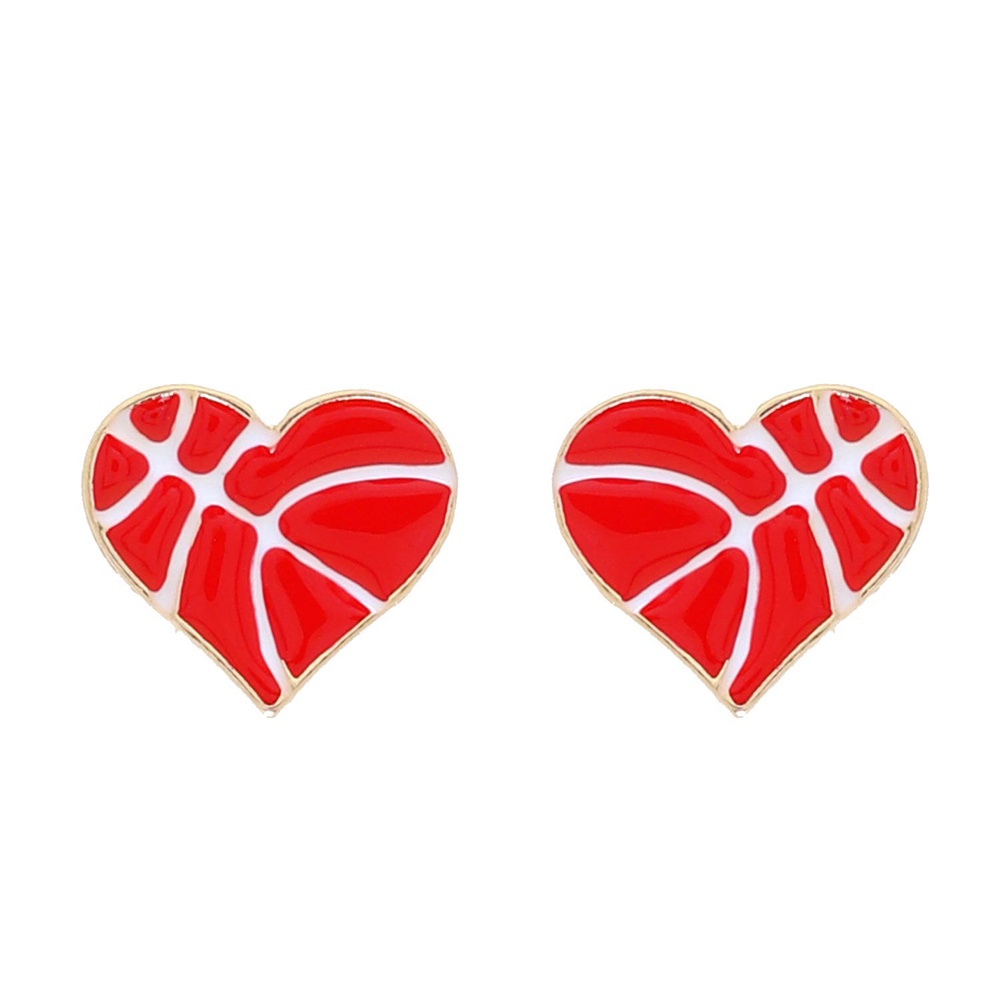 HEART SHAPED ENAMEL COATED BASKETBALL STUD EARRINGS IN GOLD TONE METAL