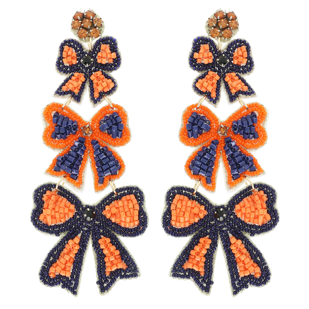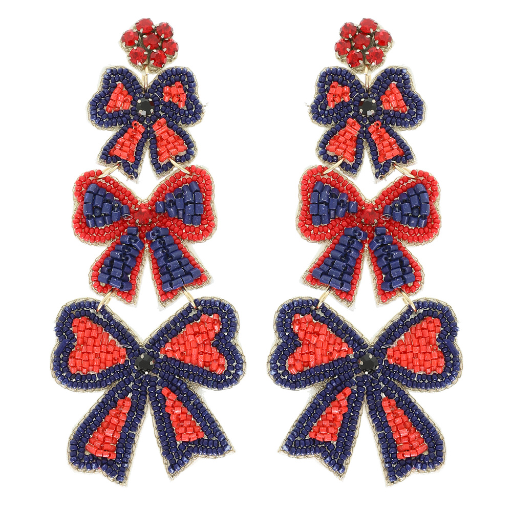 MULTI-TIERED GAME DAY STRIPED BOW RIBBON RHINESTONE SEED BEADED STUD EARRINGS