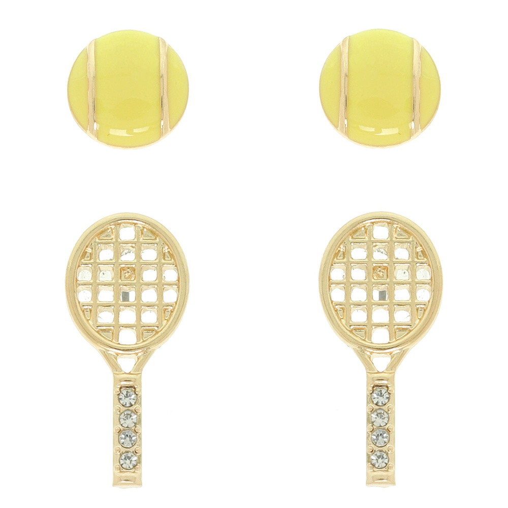 2-PAIR POLISHED AND RHINESTONE EMBELLISHED EARRING SET FEATURING TENNIS BALL AND RACKET