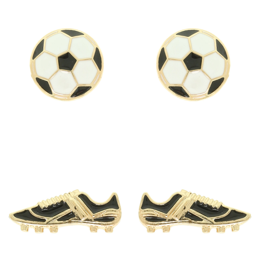 ENAMEL STUD EARRINGS FEATURING SOCCER BALL AND CLEAT DESIGN IN GOLD TONE METAL