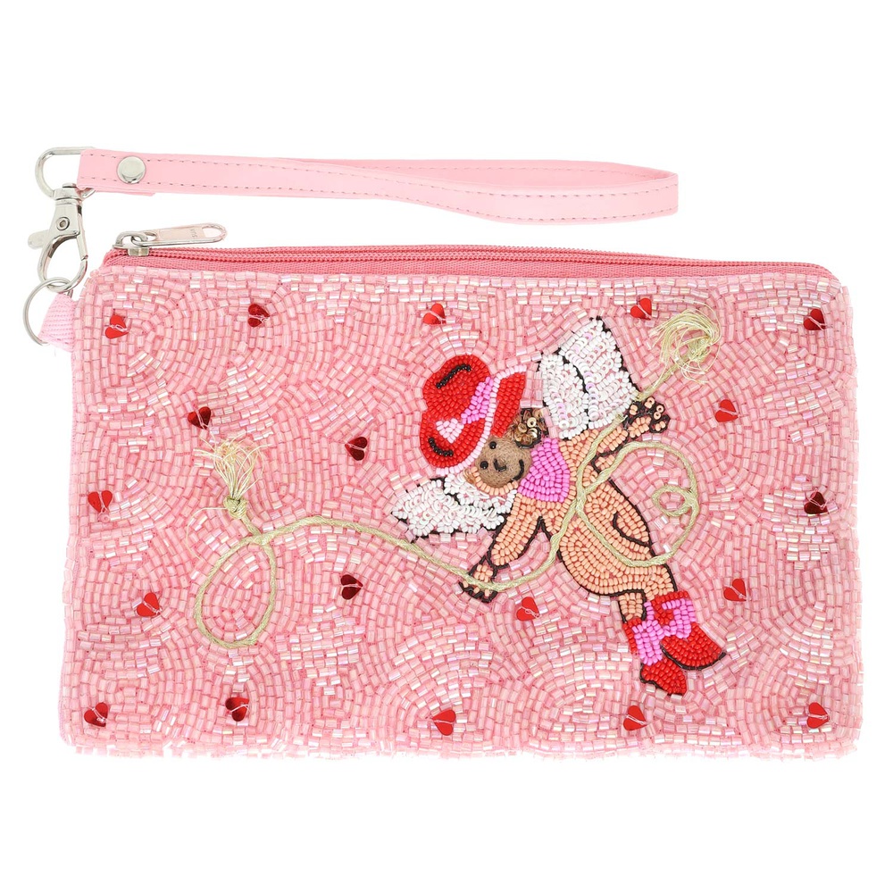 WESTERN CUPID HEART SEQUIN SEED BEAD HANDMADE BEADED EMBROIDERY ZIPPER COIN BAG WITH WRISTLET STRAP