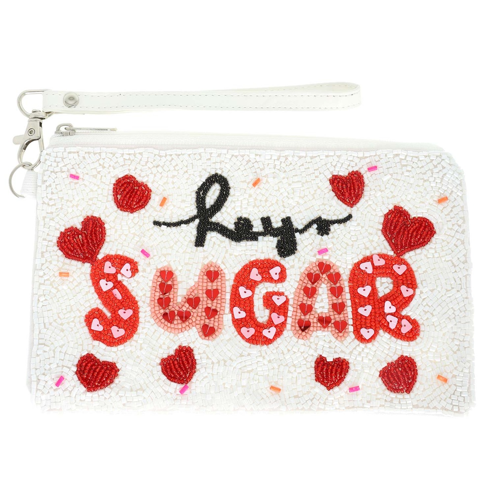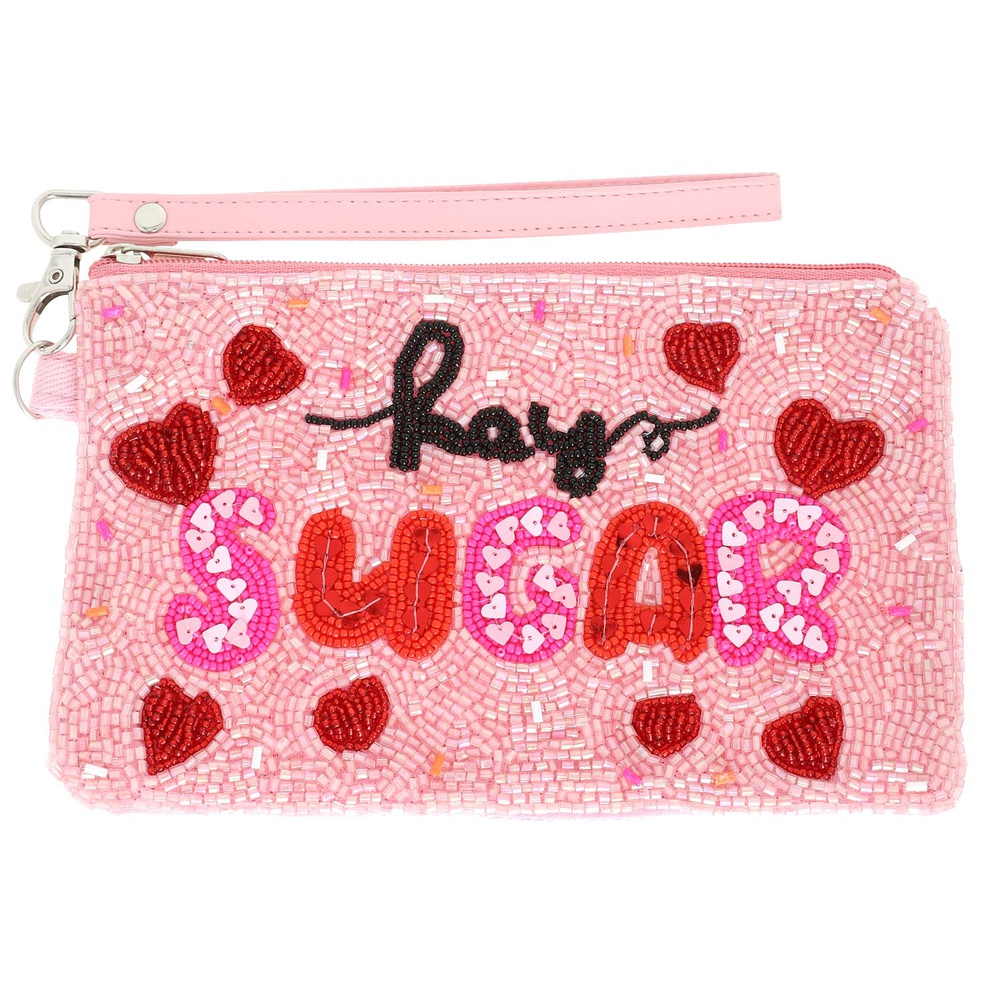 "HEY SUGAR" HEART PRINT SEED BEAD HANDMADE BEADED ZIPPER COIN BAG WITH WRISTLET STRAP