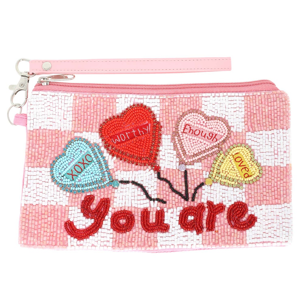"YOU ARE XOXO, ENOUGH, WORTHY, LOVED" CHECKERED CONVERSATION HEART BALLOONS SEED BEAD HANDMADE BEADED ZIPPER COIN BAG WITH WRISTLET STRAP