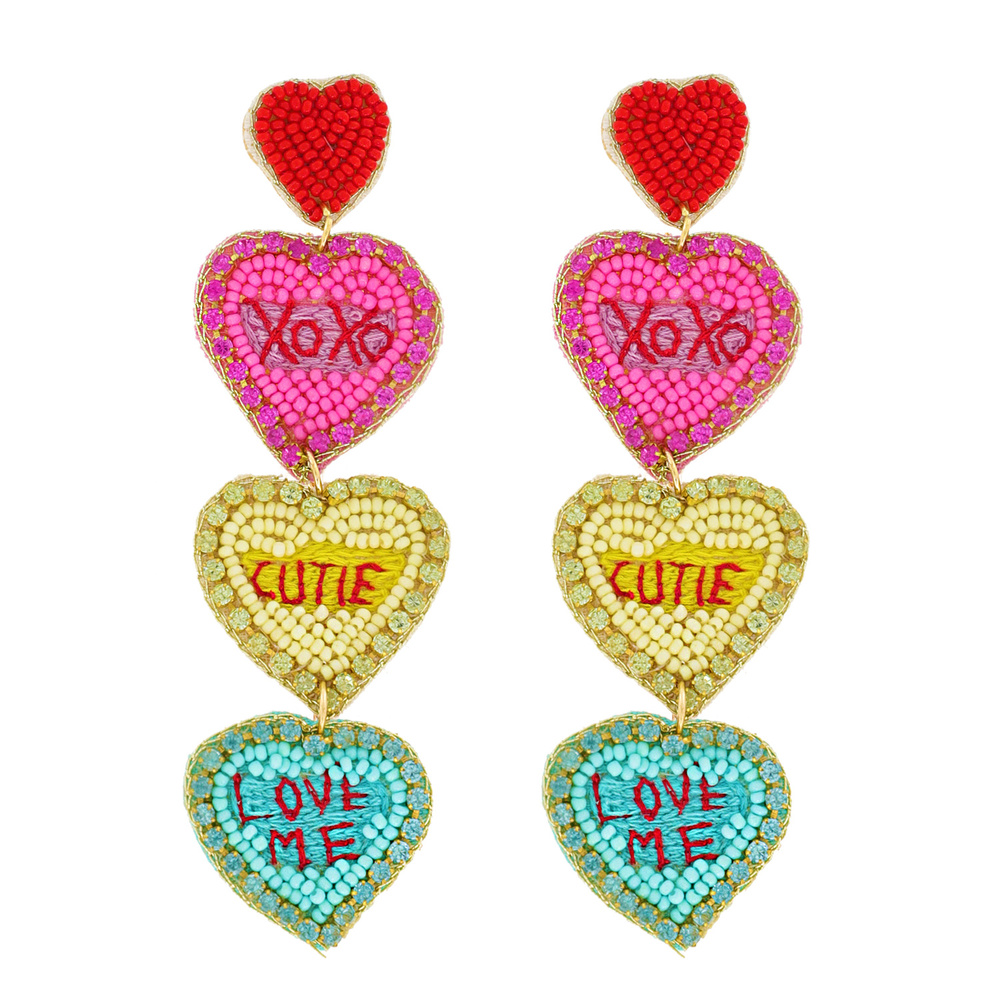 3-tier Conversation Hearts Seed Bead Handmade Beaded Embroidery Jeweled Long Drop Earrings