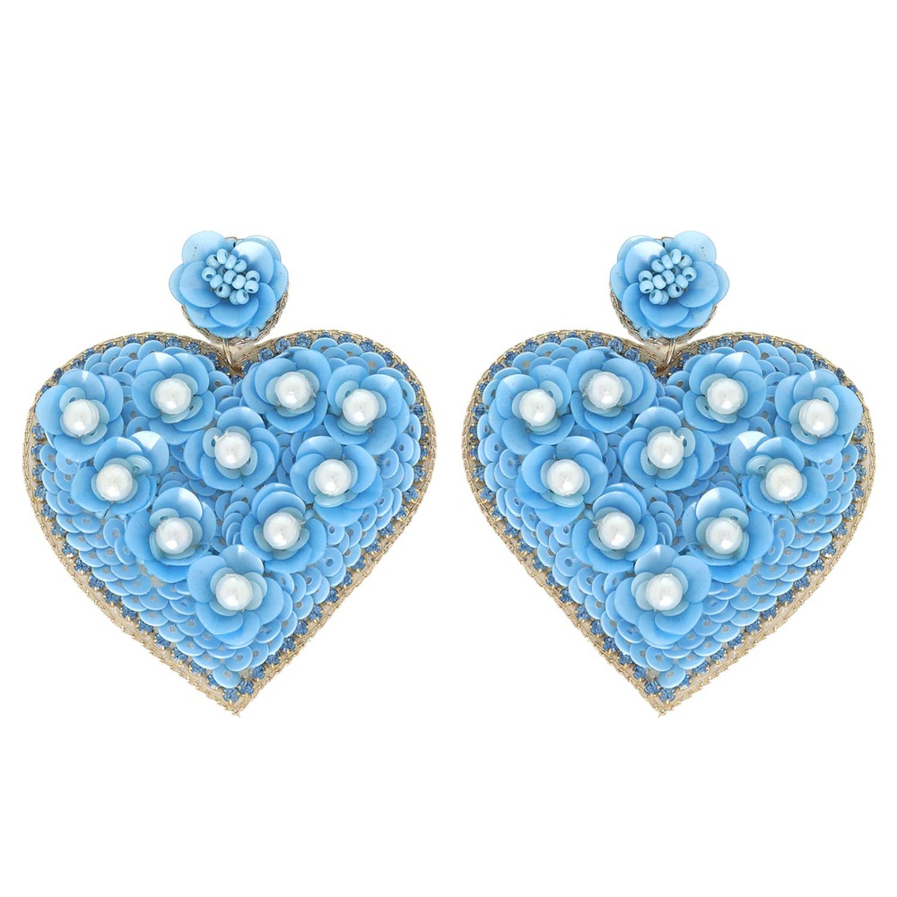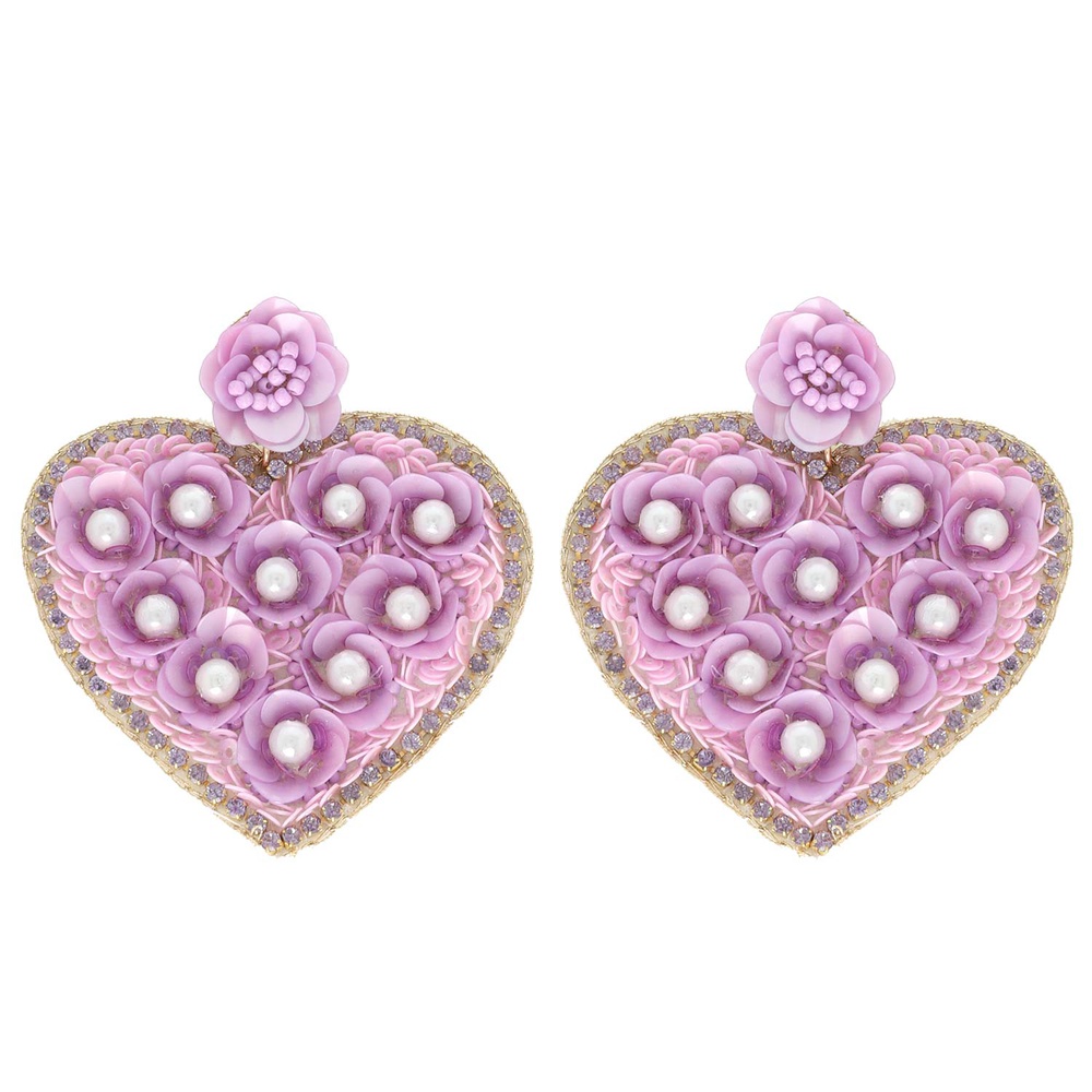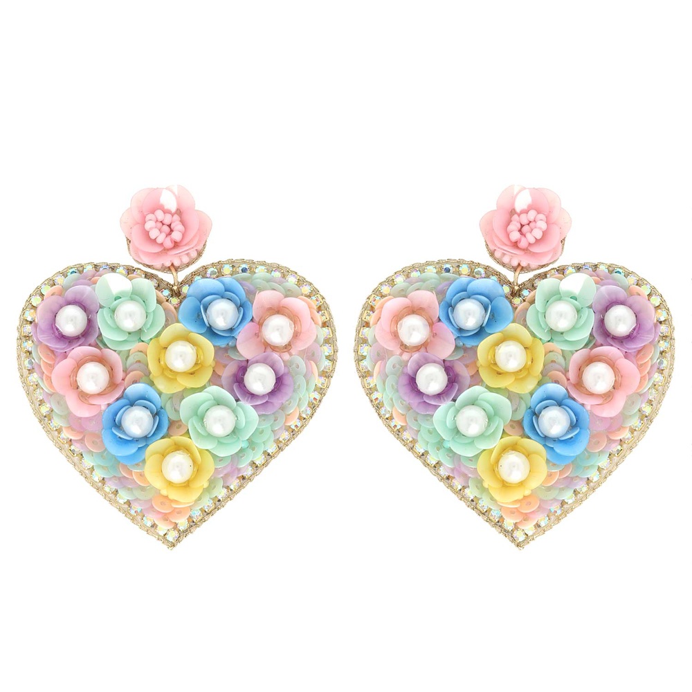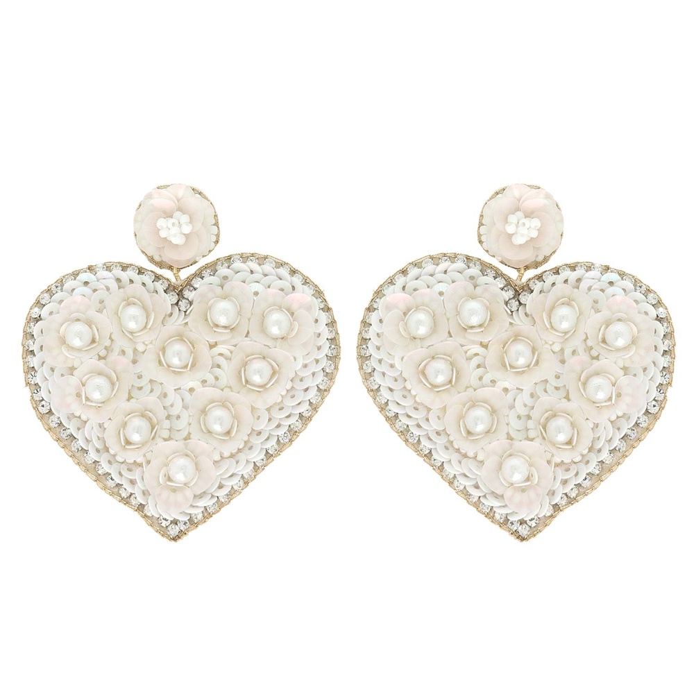 2-TIER FLORAL PEARL AND CRYSTAL RHINESTONE BEADED EMBROIDERY HEART SHAPED VALENTINE'S DAY DROP EARRINGS