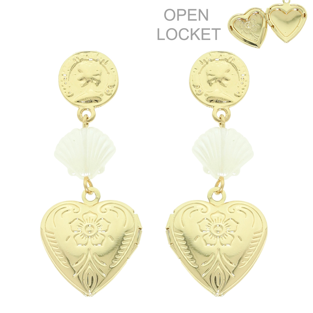 SEASHELL ARTICULATED LOCKET HEART POST DANGLE EARRINGS