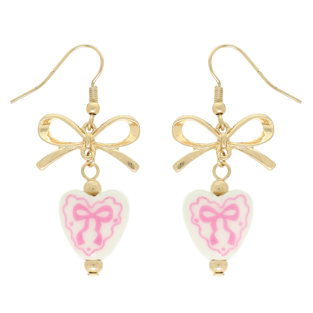 CERAMIC HEART CHARM DANGLE EARRINGS WITH BOW ACCENT IN GOLD TONE METAL
