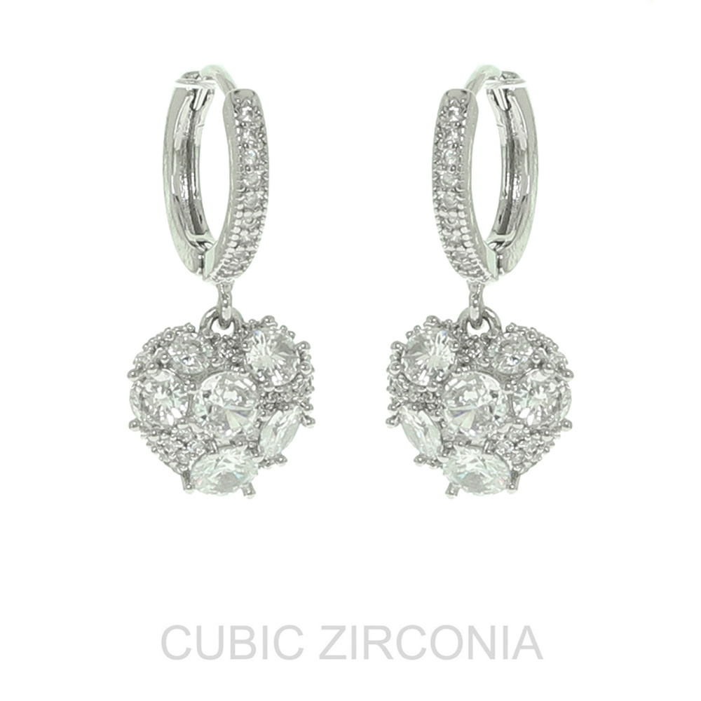 CUBIC ZIRCONIA PUFFY HEART HUGGIE HOOP EARRINGS IN SILVER TONE METAL