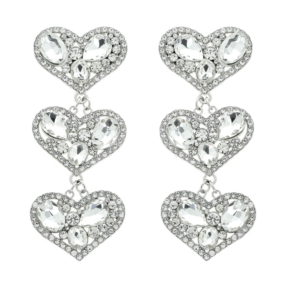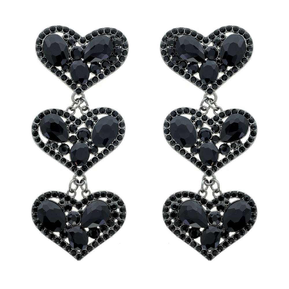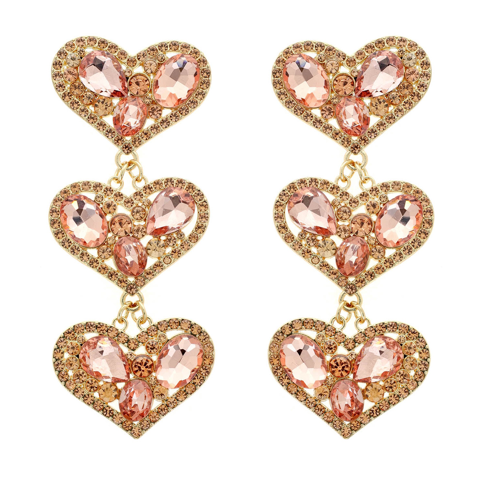 Rhinestone Outlined Three Heart Long Drop Earrings With Crystal Gemstones