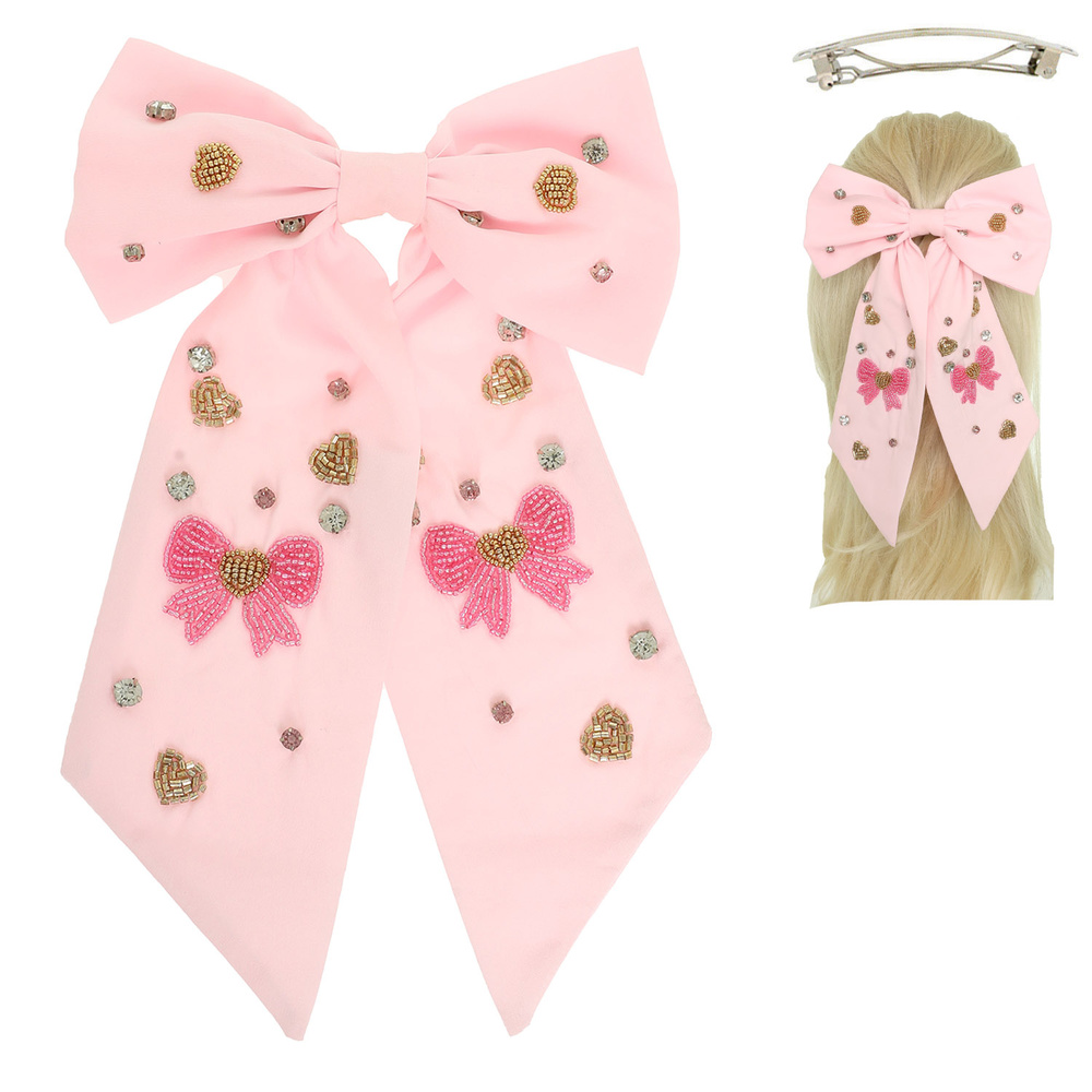 HEART THEME CRYSTAL SEED BEAD EMBELLISHED BOW BARRETTE HAIR CLIP