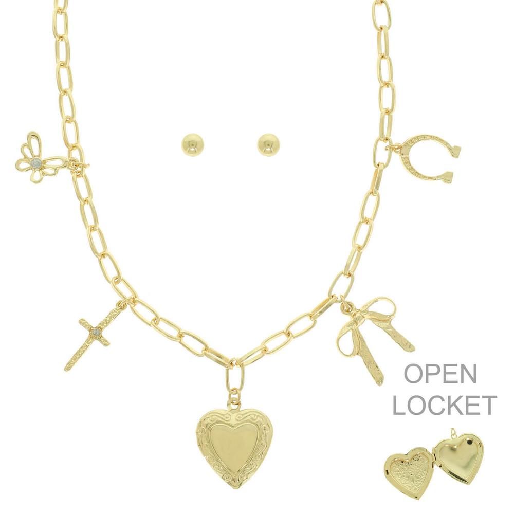 MULTI-CHARM NECKLACE EARRING SET FEATURES HEART LOCKET, AND TRINKETS