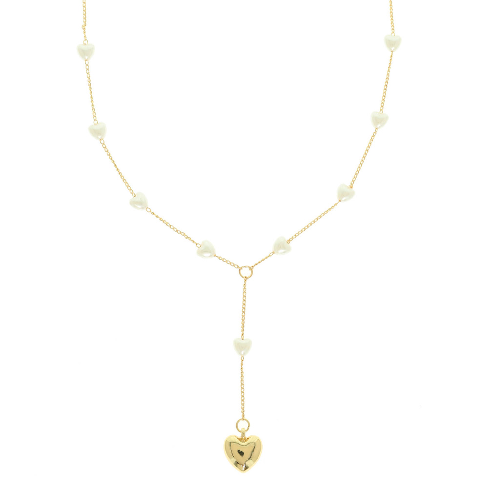 PUFFY HEART PENDANT PEARL BEAD LARIAT NECKLACE IN GOLD-TONE METAL