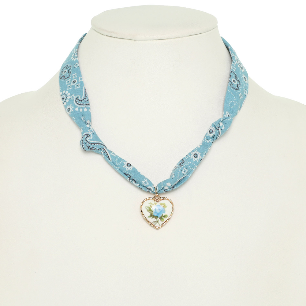 FLORAL PORCELAIN HEART PENDANT SCARF NECKLACE WITH BANDANA PRINT FABRIC TIES