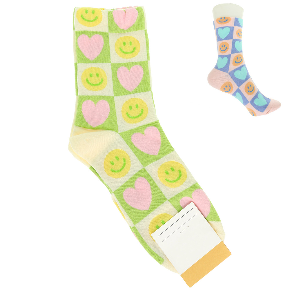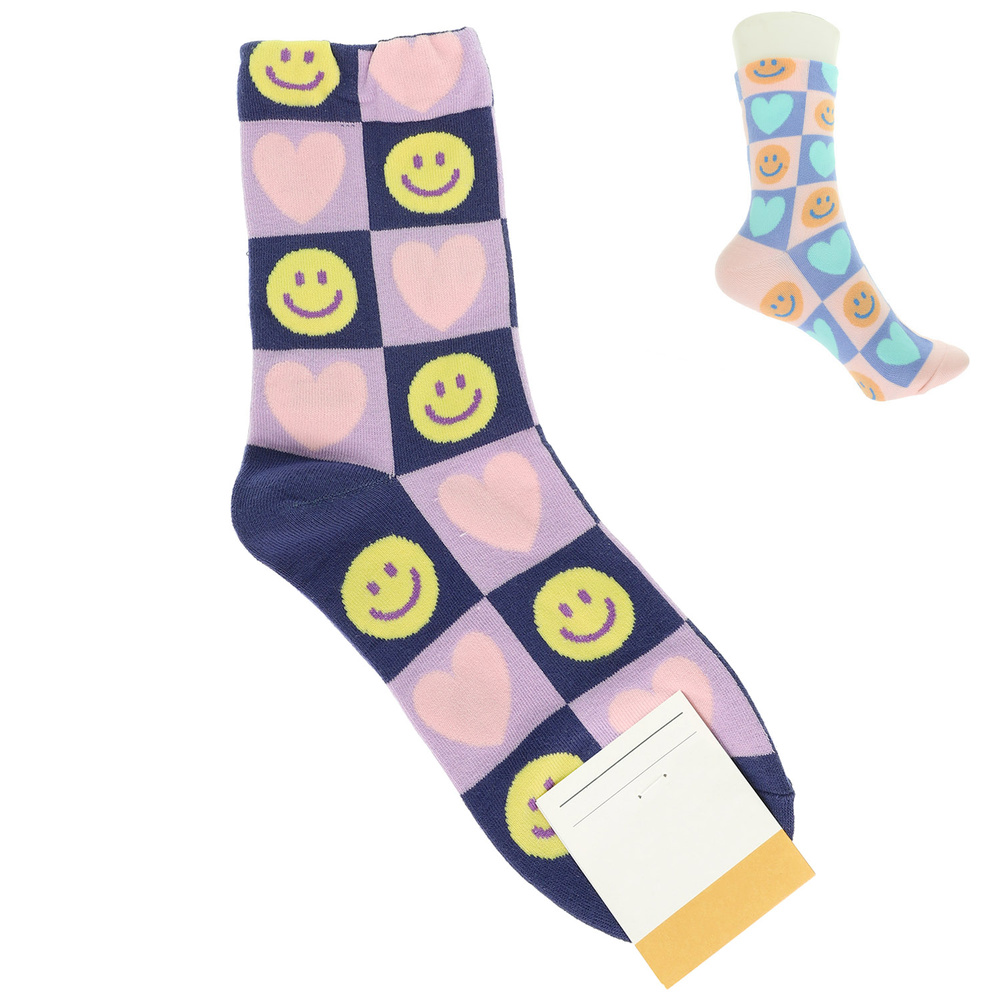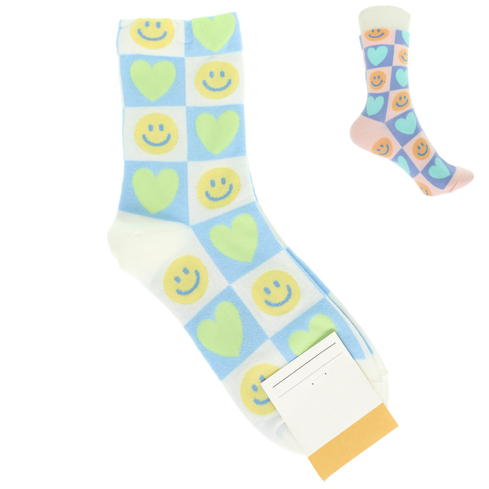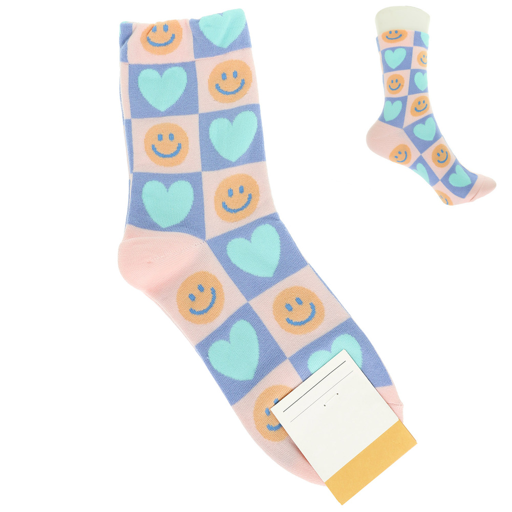 WOMEN'S SMILEY FACE WITH HEART COLORBLOCK PATTERN COTTON KNIT NOVELTY SOCKS