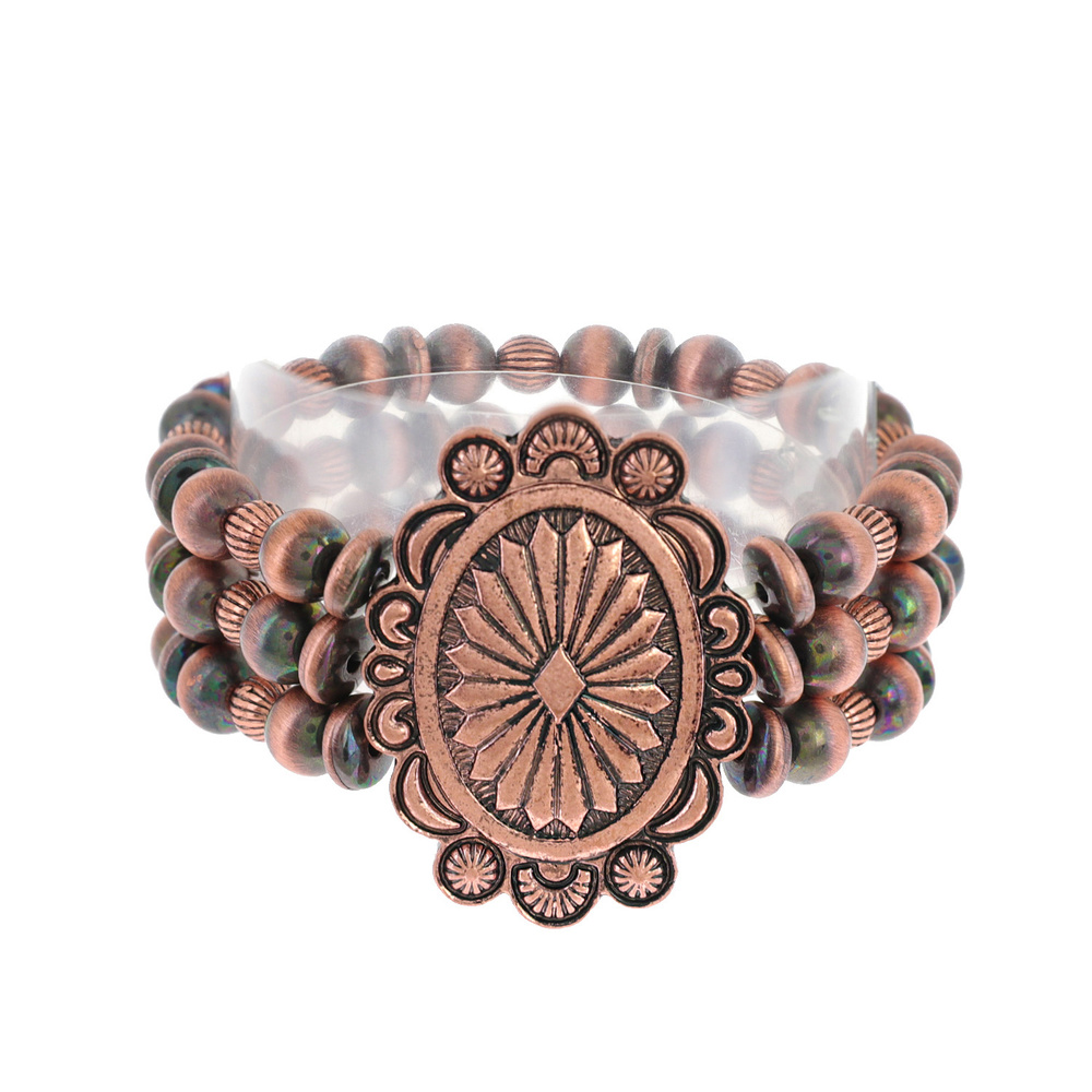 Western Navajo Pearl Beaded Multistrand Scalloped Oval Concho Stretch Bracelet