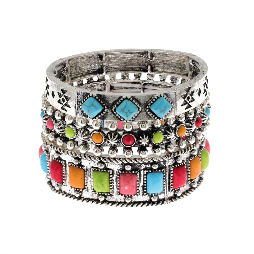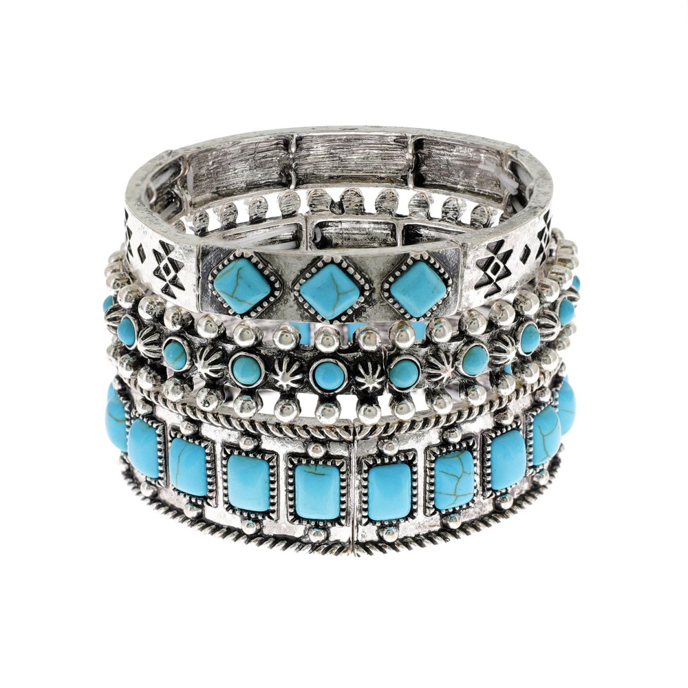 3-piece Western Turquoise Semi Stone Stretch Bracelet Set In Silver Tone Oxidized Metal